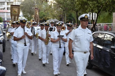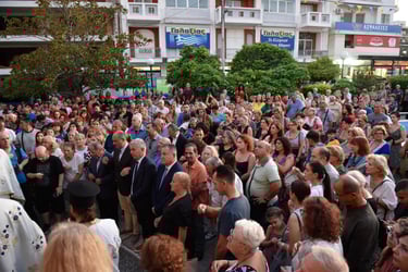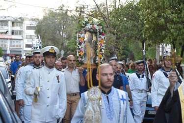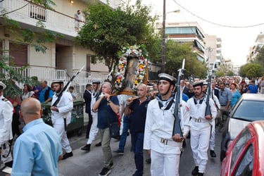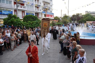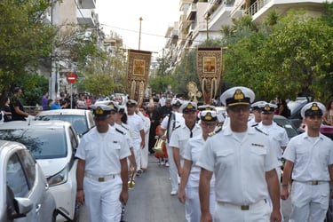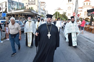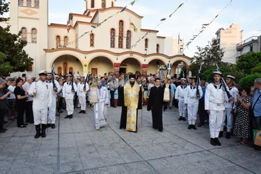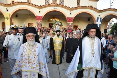 Ανήμερα της εορτής τελέστηκε πανηγυρικός Εσπερινός χωροστατούντος του Επισκόπου Ευρίπου Χρυσόστομου, ενώ στη συνέχεια πραγματοποιήθηκε ιερά λιτανεία της θαυματουργής εικόνας της Παναγίας της Οδηγήτριας στους δρόμους της ενορίας μας με τη συνοδεία κλήρου, λαού, της φιλαρμονικής του Λιμενικού Σώματος και αγήματος του Πολεμικού μας Ναυτικού.