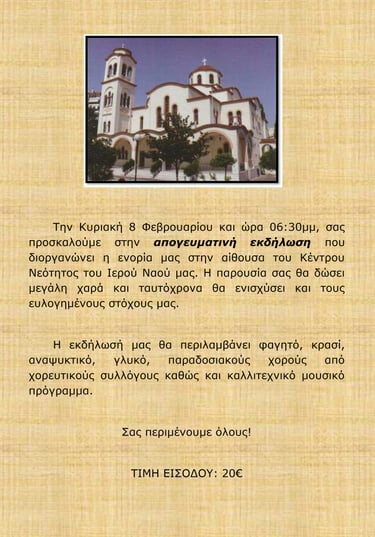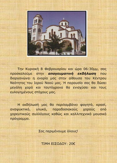 Την Κυριακή 8 Φεβρουαρίου και ώρα 06:30μμ, σας προσκαλούμε στην απογευματινή εκδήλωση που διοργανώνει η ενορία μας στην αίθουσα του Κέντρου Νεότητος του Ιερού Ναού μας. Η παρουσία σας θα δώσει μεγάλη χαρά και ταυτόχρονα θα ενισχύσει και τους ευλογημένους στόχους μας.