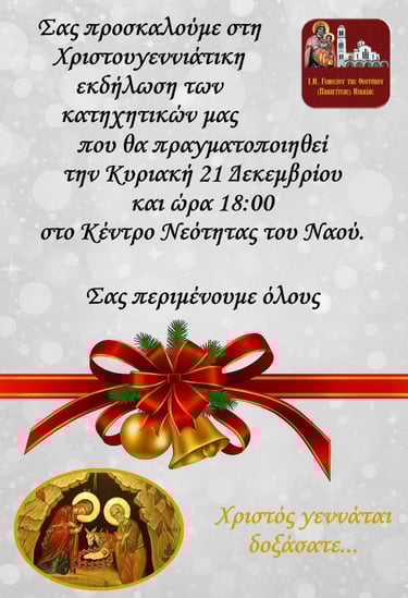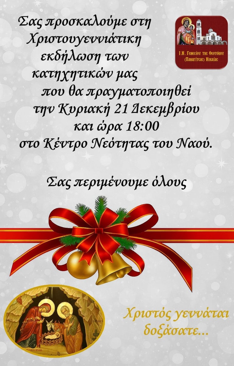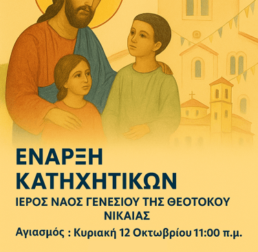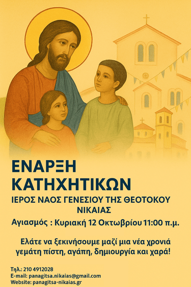 Με τη χάρη του Θεού, τις πρεσβείες των Αγίων μας και τις ευλογίες του Σεβασμιωτάτου Ποιμενάρχου μας κ. ΑΛΕΞΙΟΥ, κάθε Σάββατο ώρα 11:00 π.μ. σας περιμένουμε στο Κατηχητικό Σχολείο της Ενορίας μας.